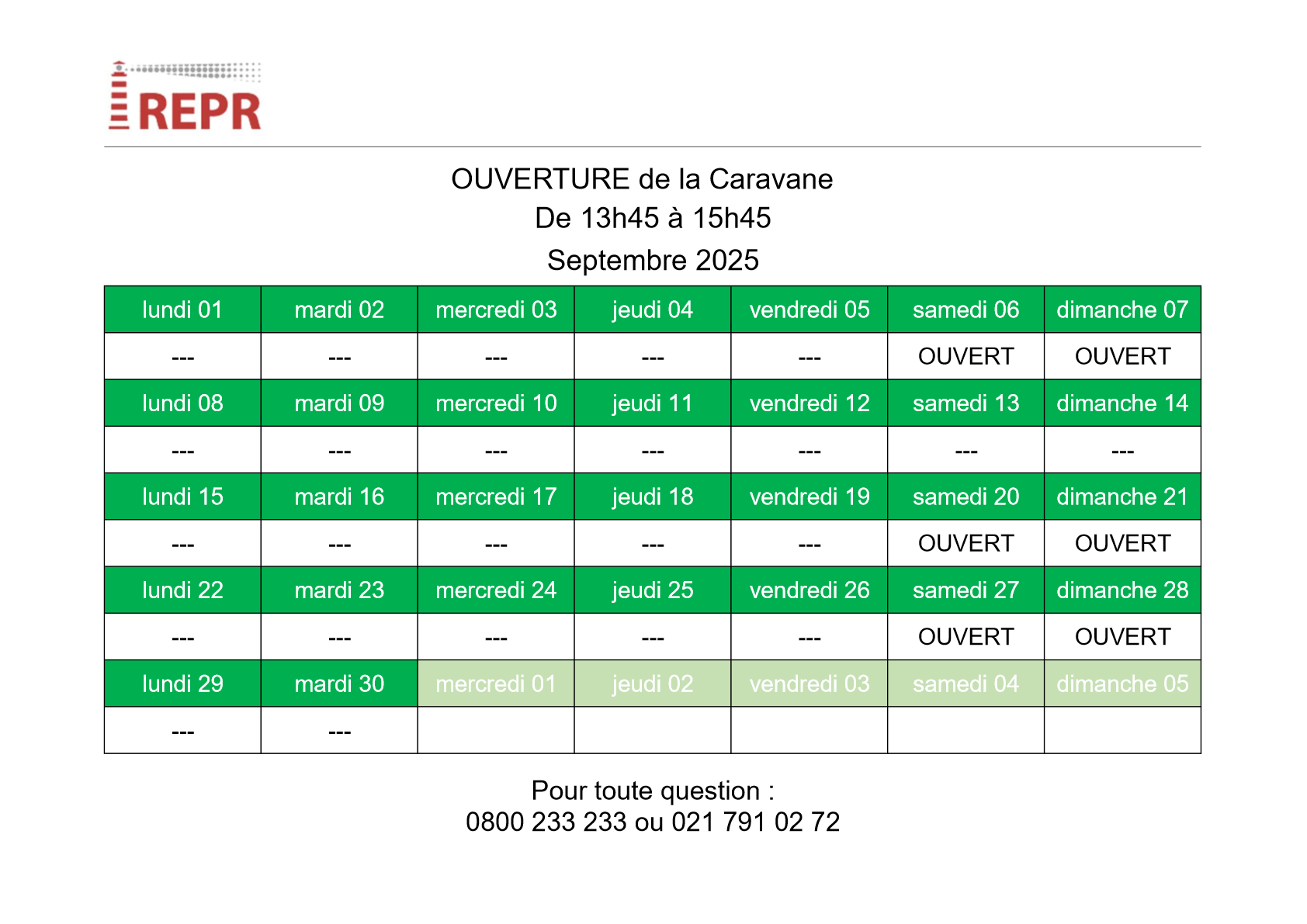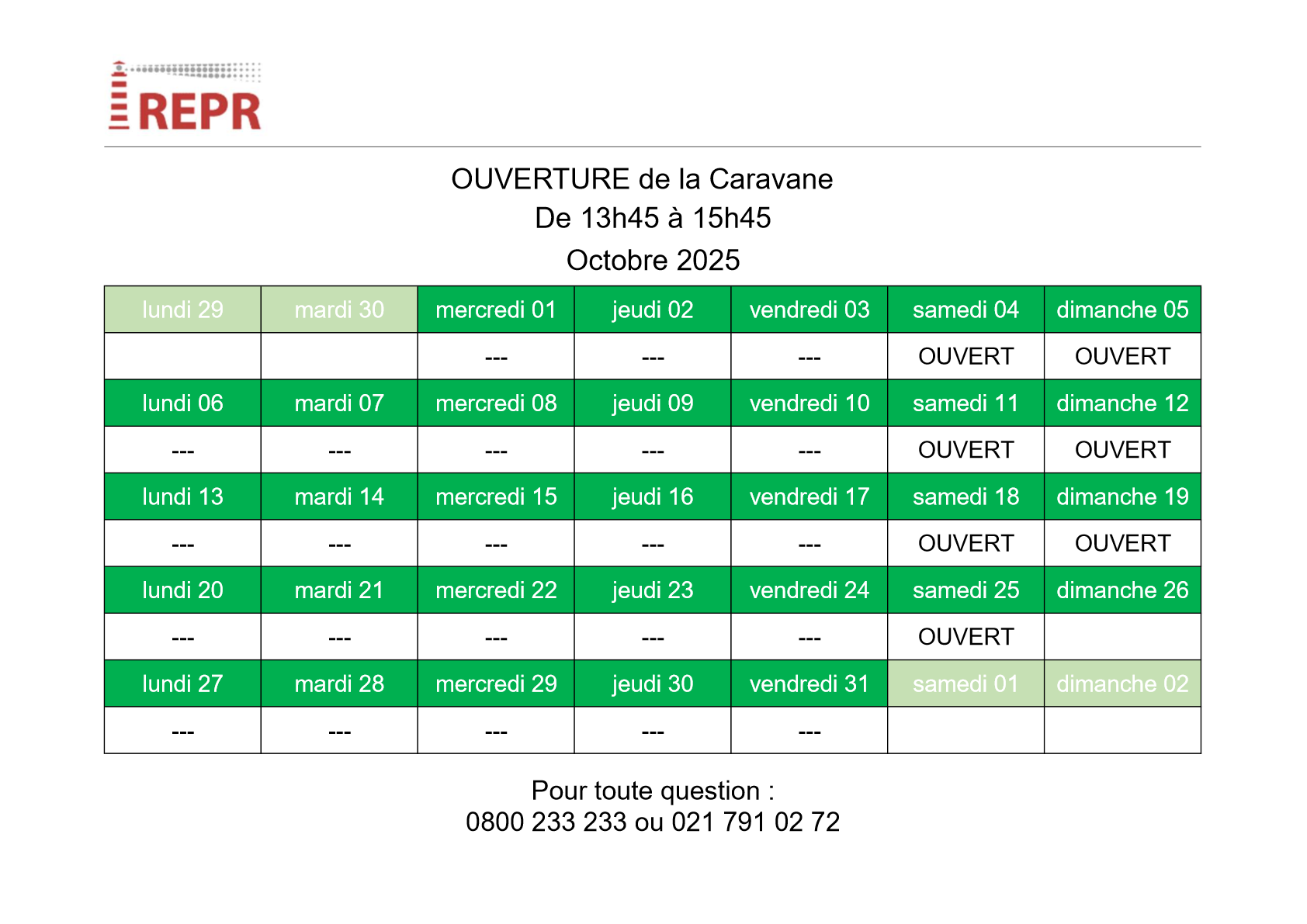Jours d’ouverture de la Caravane